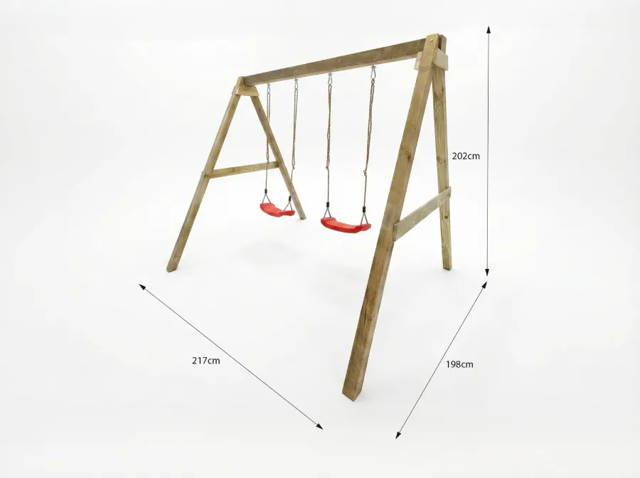 Gyngestativet er fremstillet af forudskåret, trykimprægneret træ, som sikrer høj holdbarhed og lang levetid ved udendørs brug. Den kraftige topbjælke og de medfølgende træafstivere (krydsafstivning) giver ekstra stabilitet og en sikker konstruktion, også ved daglig leg.