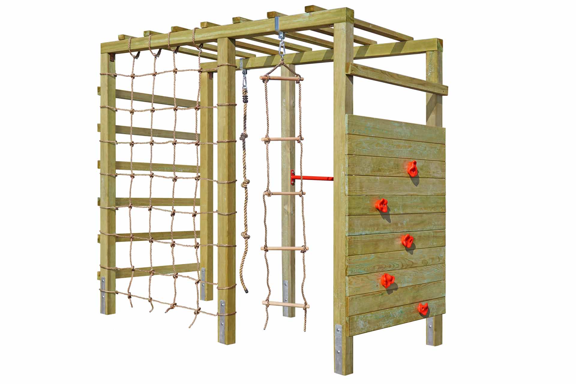 Klatretårnet er udstyret med flere forskellige legeelementer, som giver variation og udvikling i legen. Den robuste klatrevæg med klatresten styrker børnenes balance og koordination, mens klatrenettet giver mulighed for både leg og træning af styrke. Armgangen i toppen udfordrer grebsstyrke og overkropsmuskler, og det integrerede reb giver ekstra klatremuligheder.