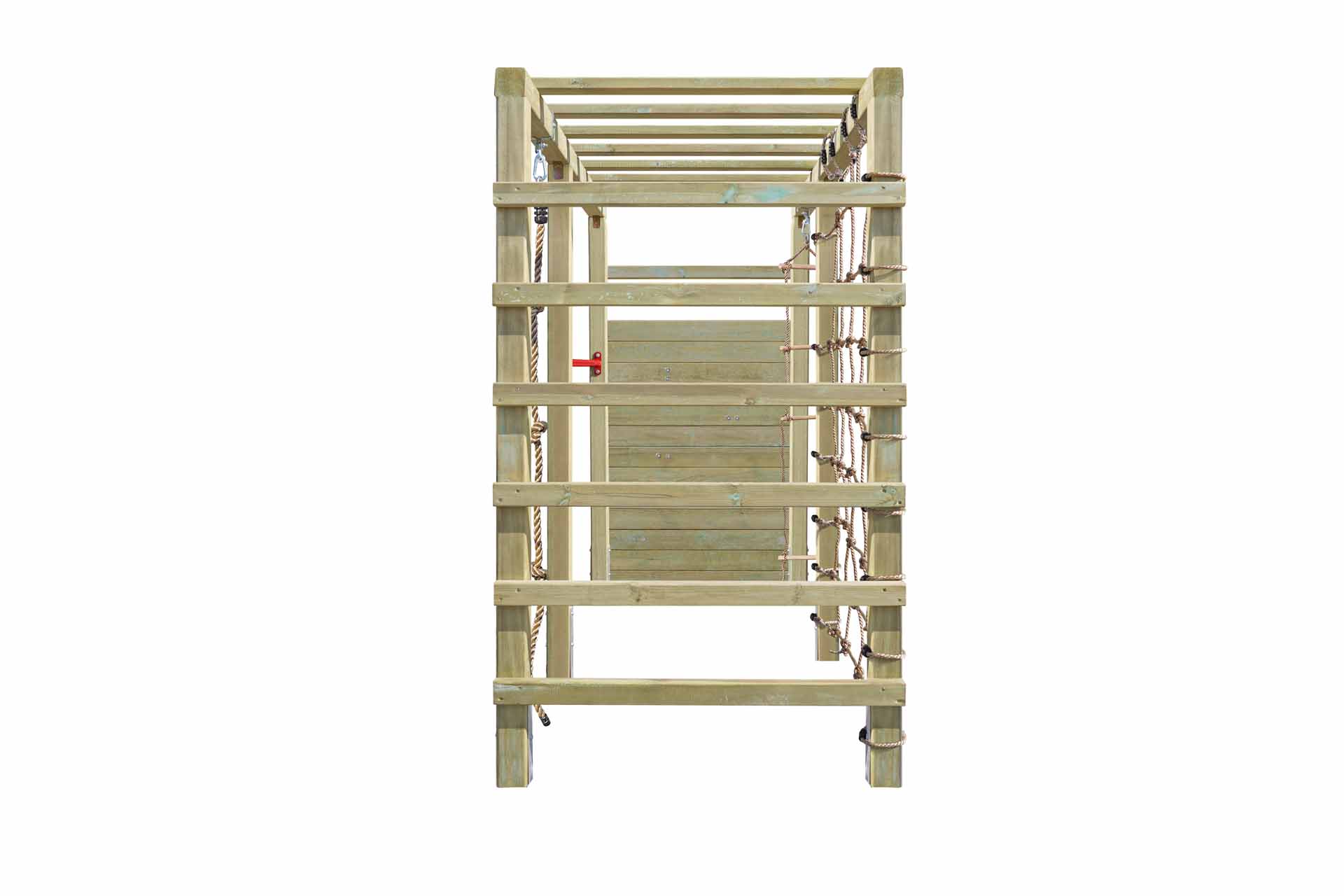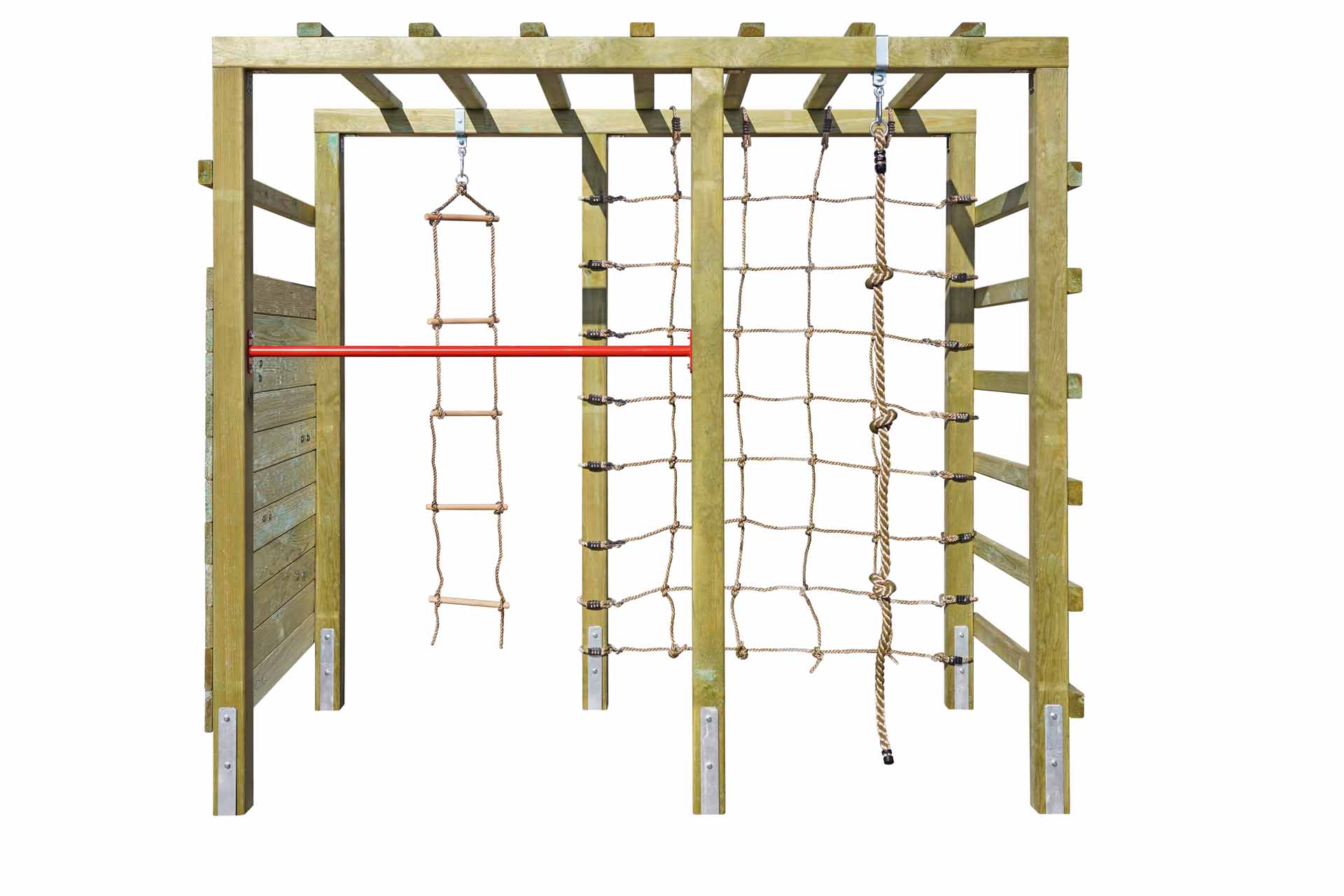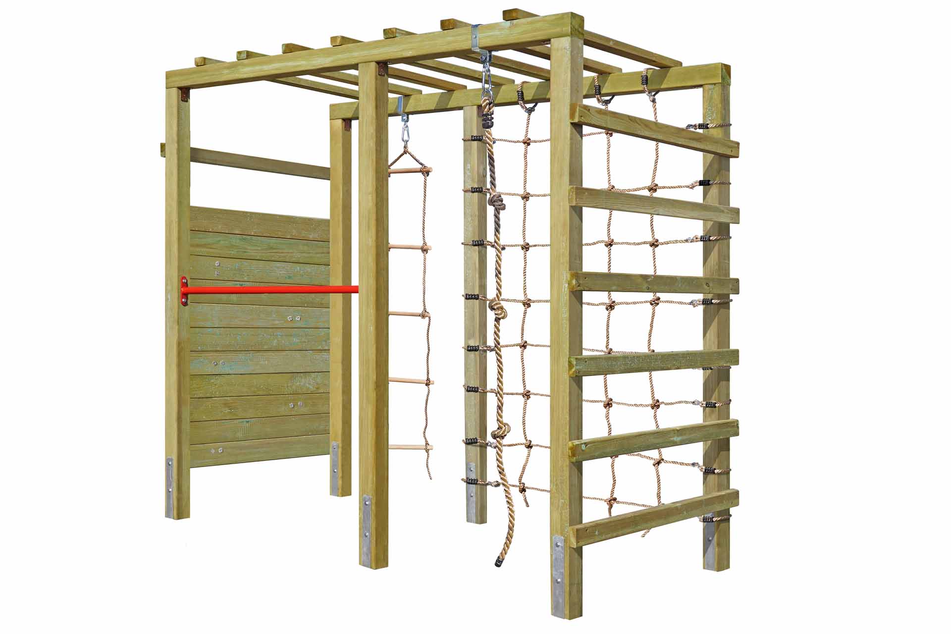 Konstruktionen er udført i trykimprægneret træ, som er velegnet til det danske klima og sikrer lang holdbarhed. Det åbne design gør, at flere børn kan lege samtidig – perfekt til søskende, legeaftaler og aktive familier.