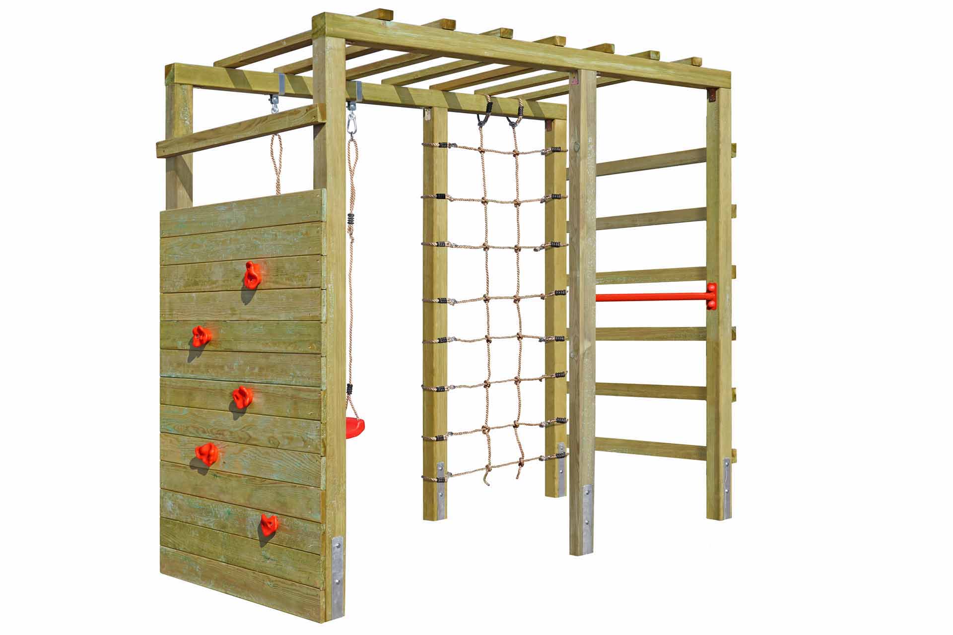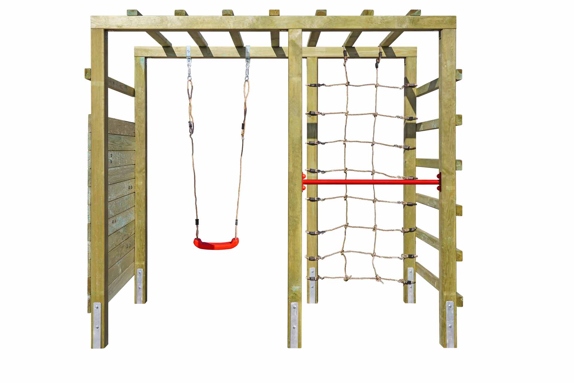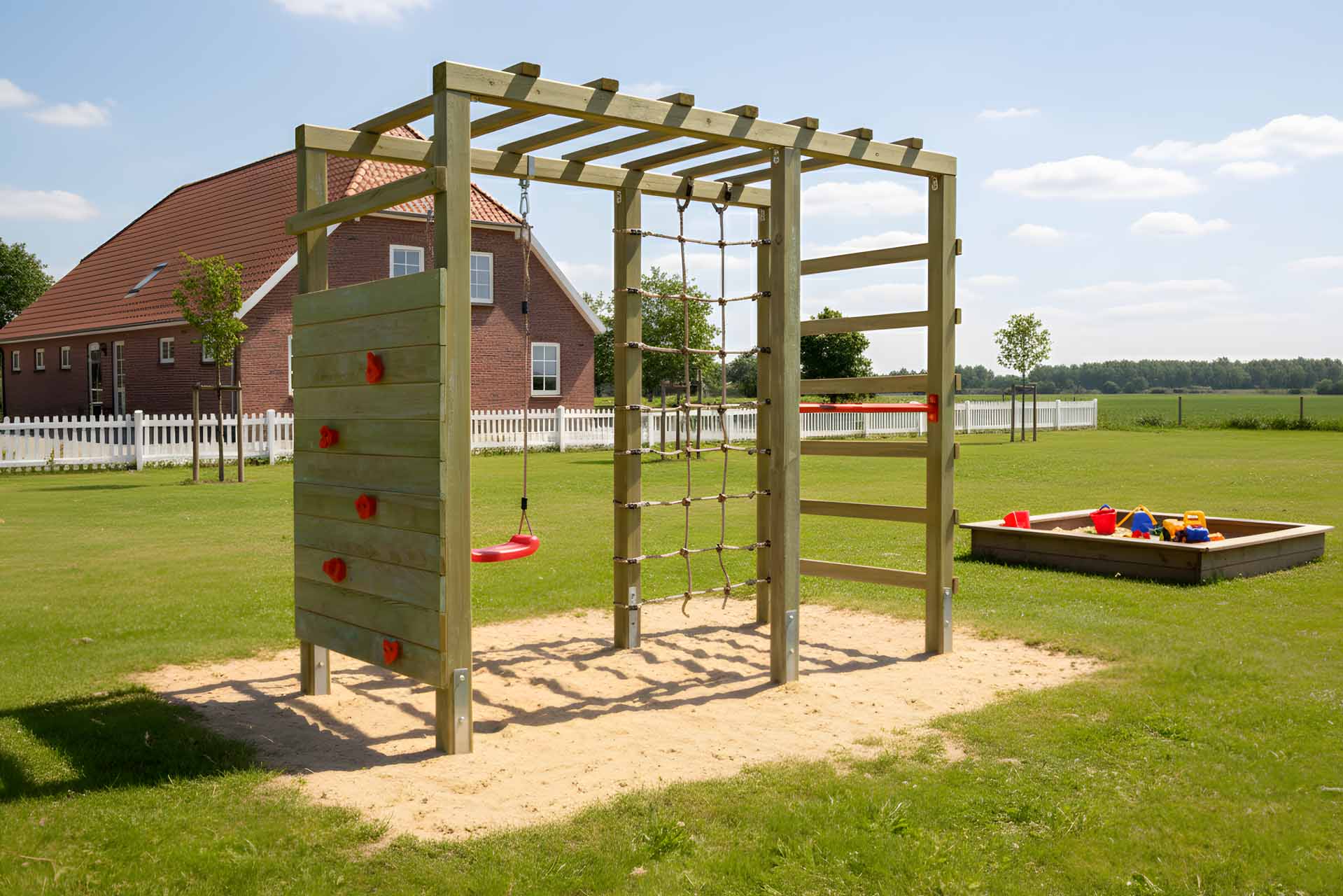 PlayActive klatrestativ er et solidt og alsidigt legeredskab i træ, der samler flere klassiske legefunktioner i én samlet løsning. Her kan børnene gynge, klatre, hænge og balancere – perfekt til aktiv udeleg og masser af bevægelse i hverdagen.