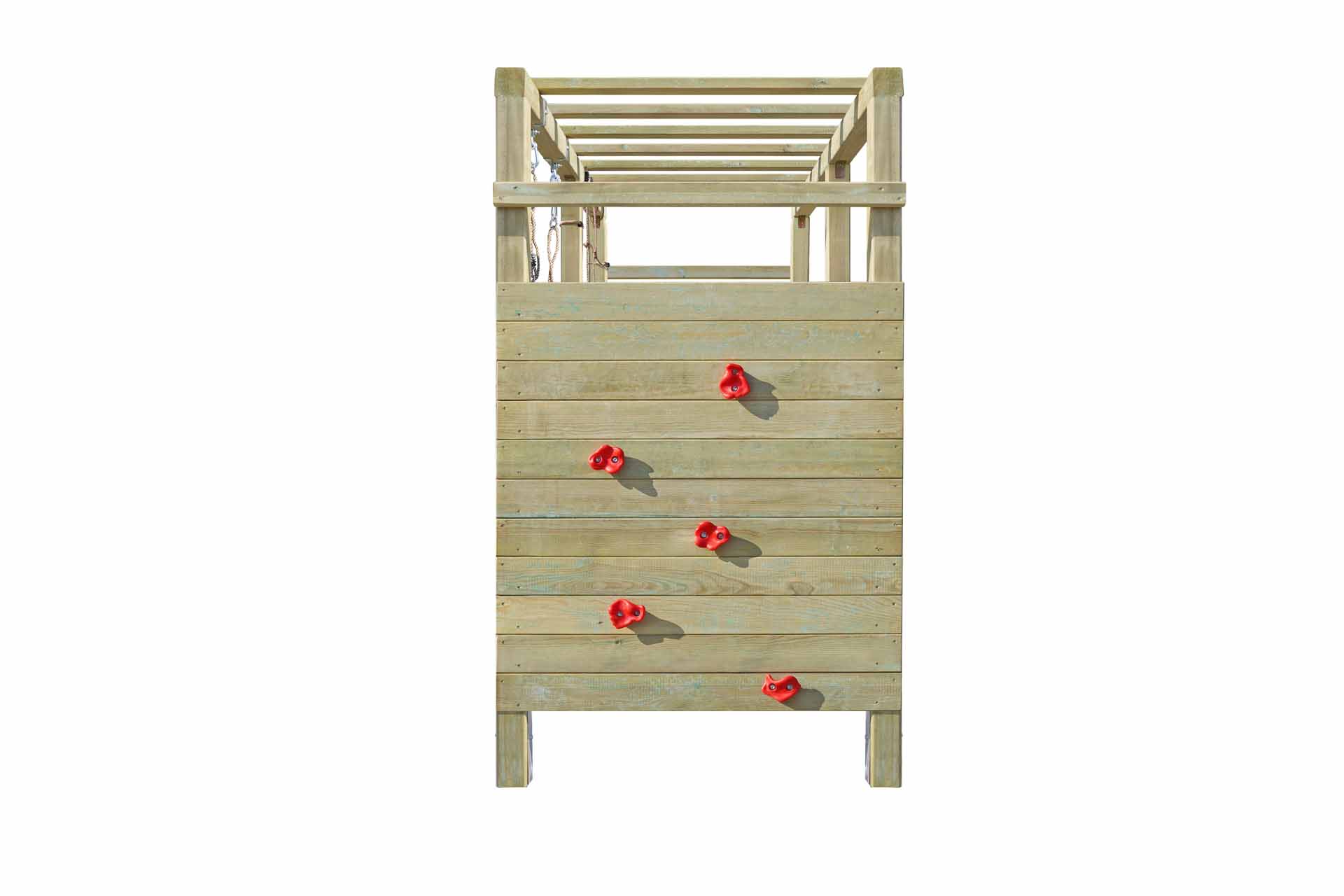 Stativet er udstyret med en gynge, som giver mulighed for både fælles leg og rolige pauser. Klatrenettet og rebstigen udfordrer balance og koordination, mens klatrevæggen med klatresten giver børnene mulighed for at styrke både motorik og selvtillid. Den integrerede armgang i toppen indbyder til leg, der styrker greb og overkrop.