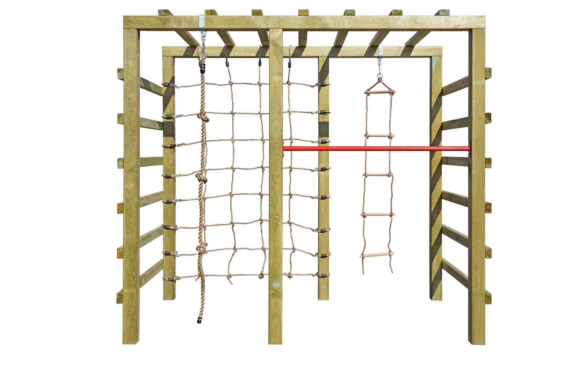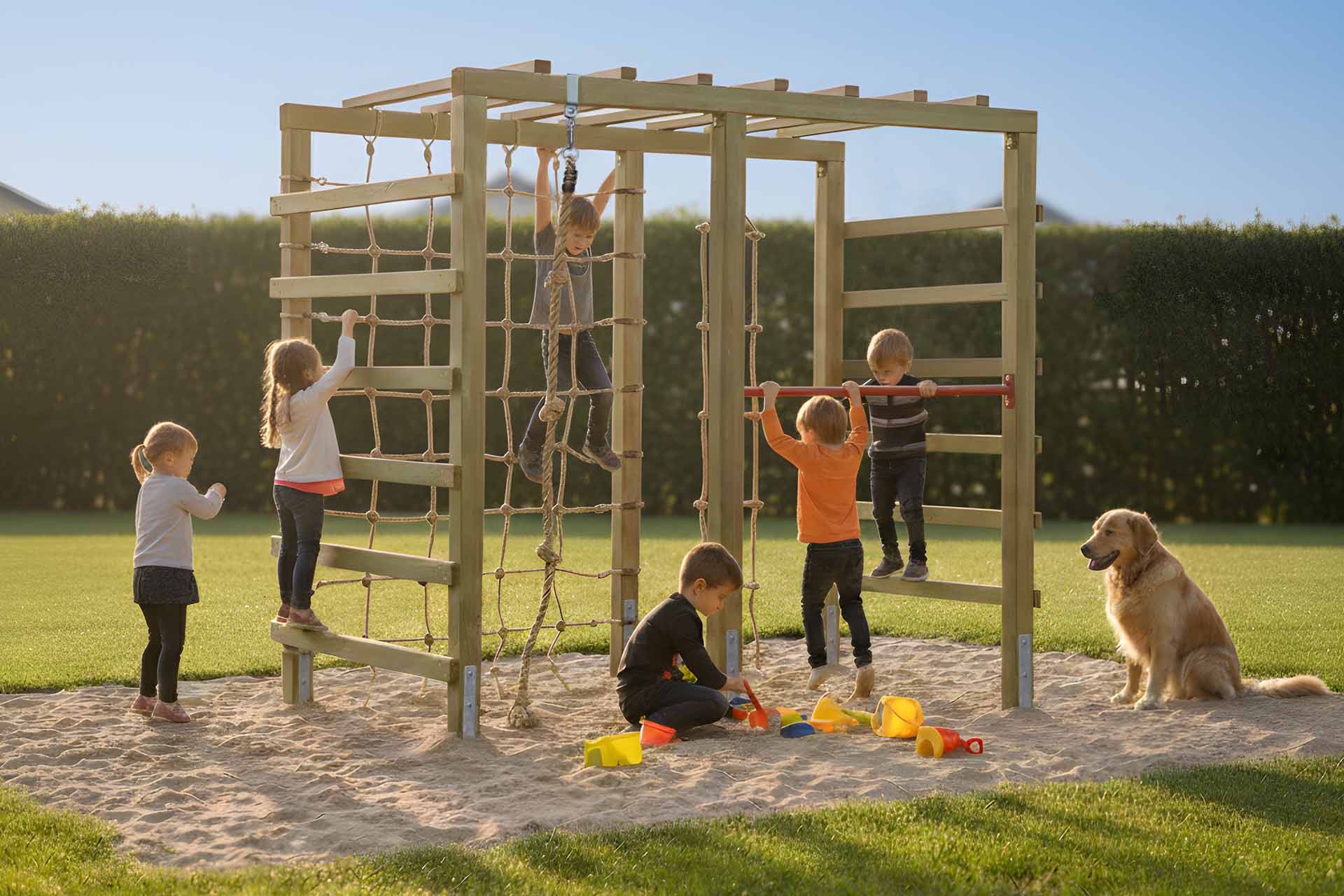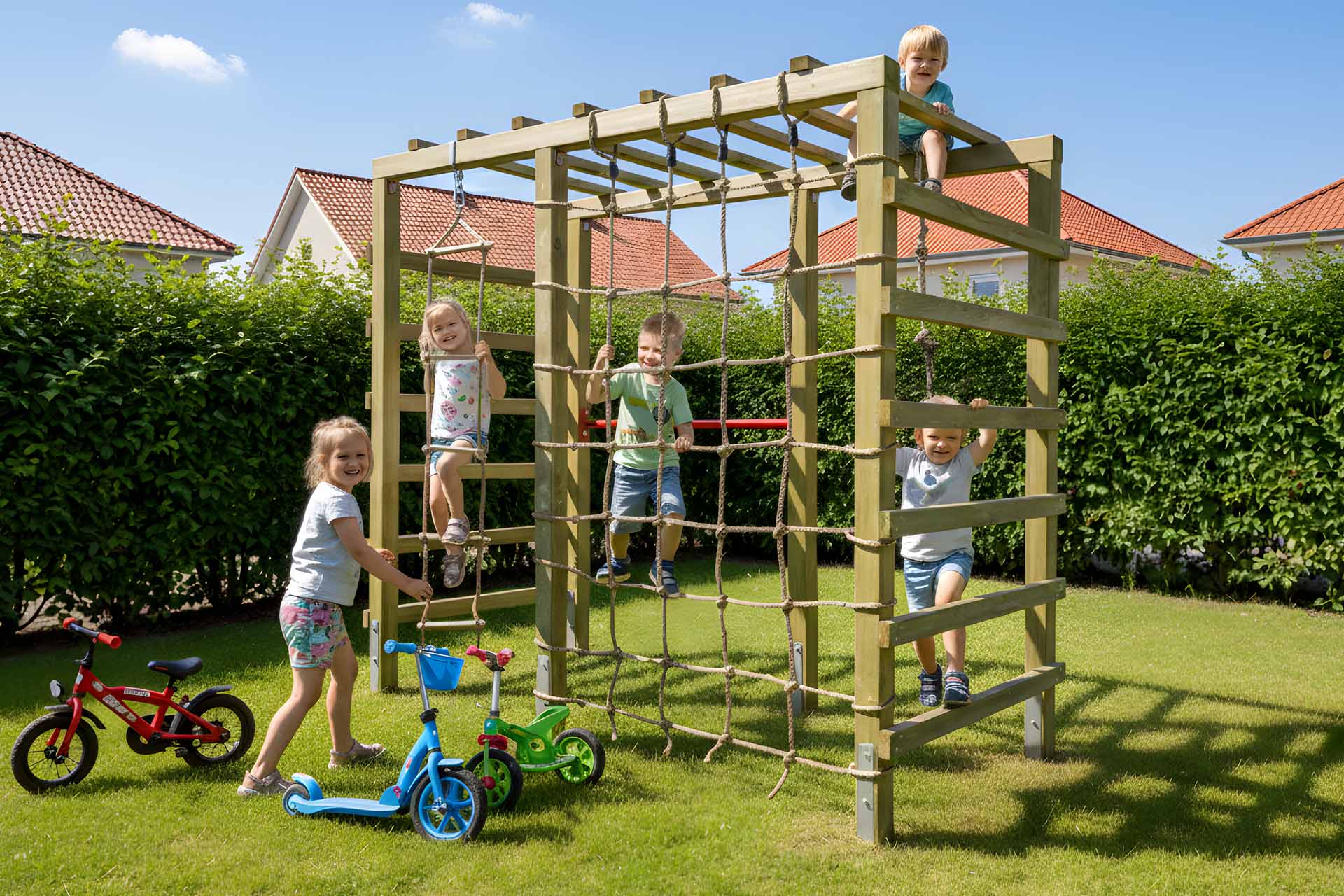 Legetårnet kombinerer flere populære klatreelementer i ét samlet legesystem: klassisk ribbevæg, kraftigt klatrereb, stabil klatrenet og overliggende monkey bars. Det giver børnene mulighed for at styrke motorik, balance, koordination og muskelstyrke, mens de leger frit i haven.