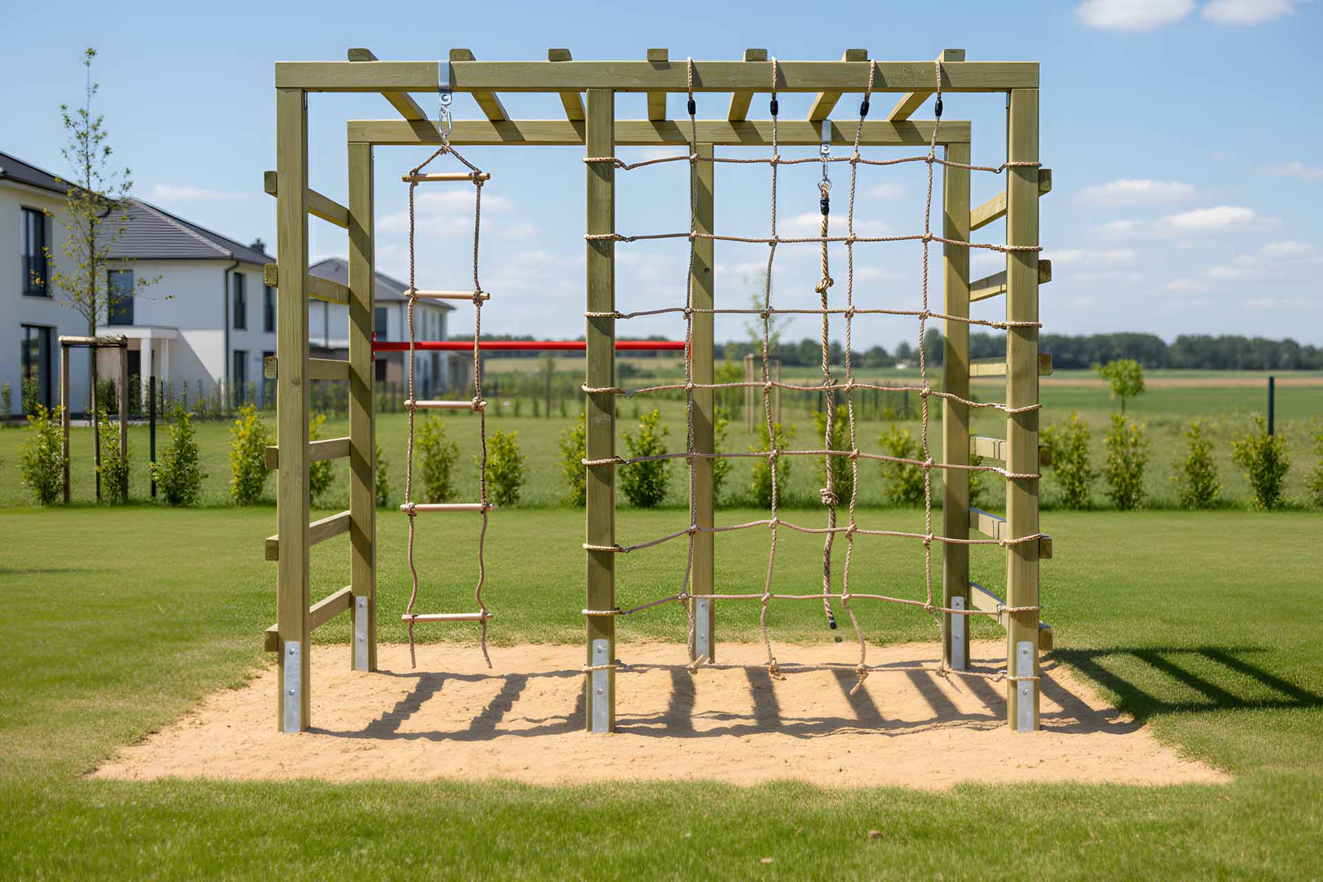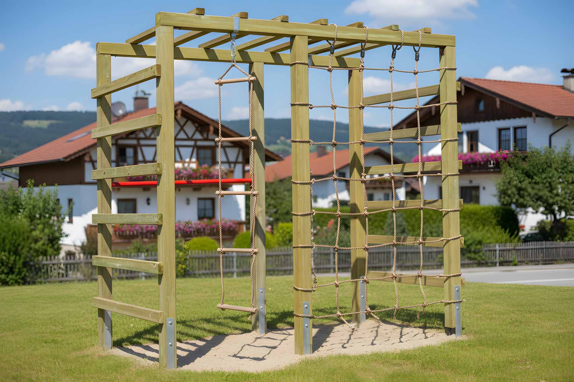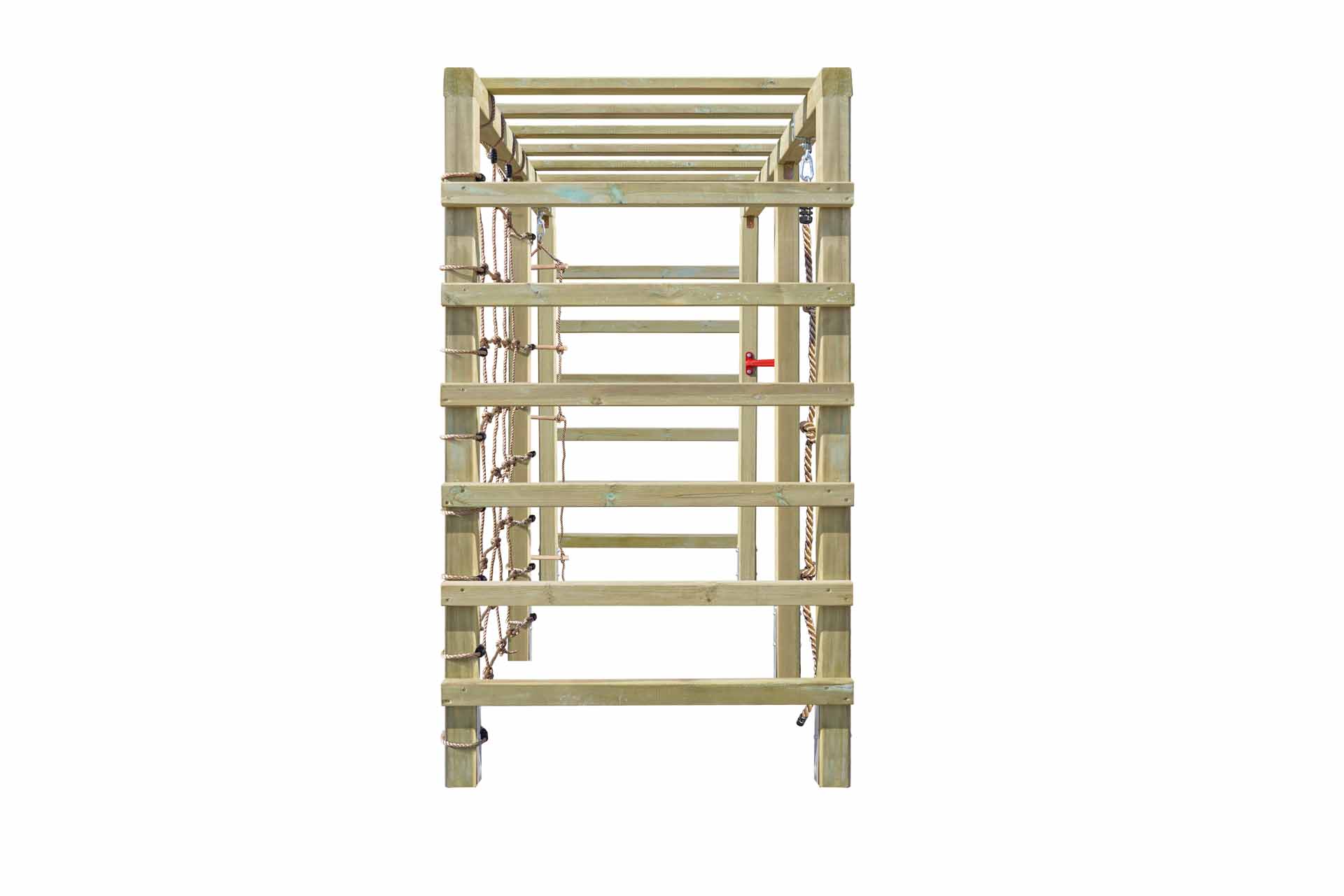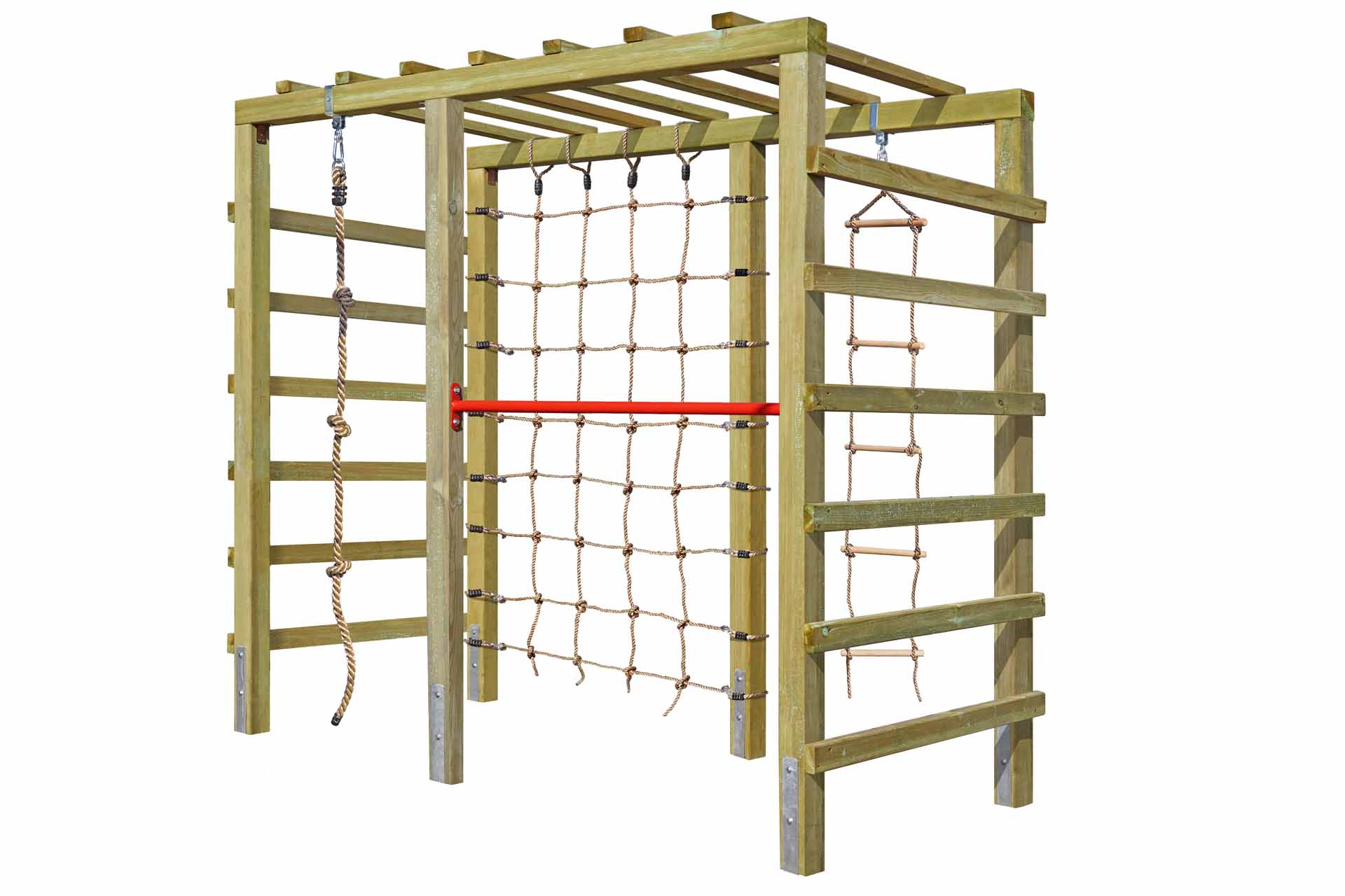 Legetårnet kombinerer flere populære klatreelementer i ét samlet legesystem: klassisk ribbevæg, kraftigt klatrereb, stabil klatrenet og overliggende monkey bars. Det giver børnene mulighed for at styrke motorik, balance, koordination og muskelstyrke, mens de leger frit i haven.