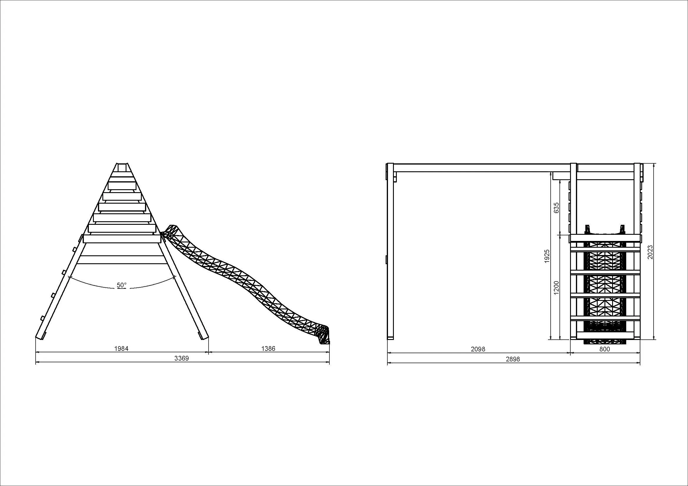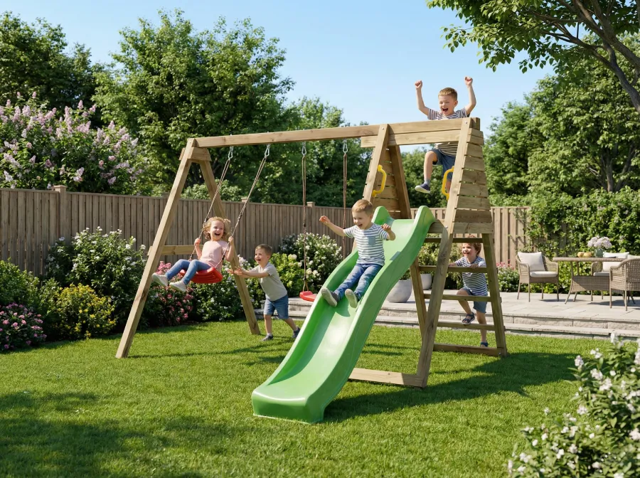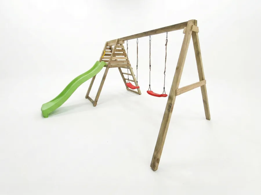 Dette alsidige lege- og gyngestativ er designet til timevis af aktiv og fantasifuld leg i haven. Med både gynger, rutsjebane og klatreelementer får børnene mulighed for at lege, bevæge sig og udfordre motorikken – alt samlet i én komplet løsning.