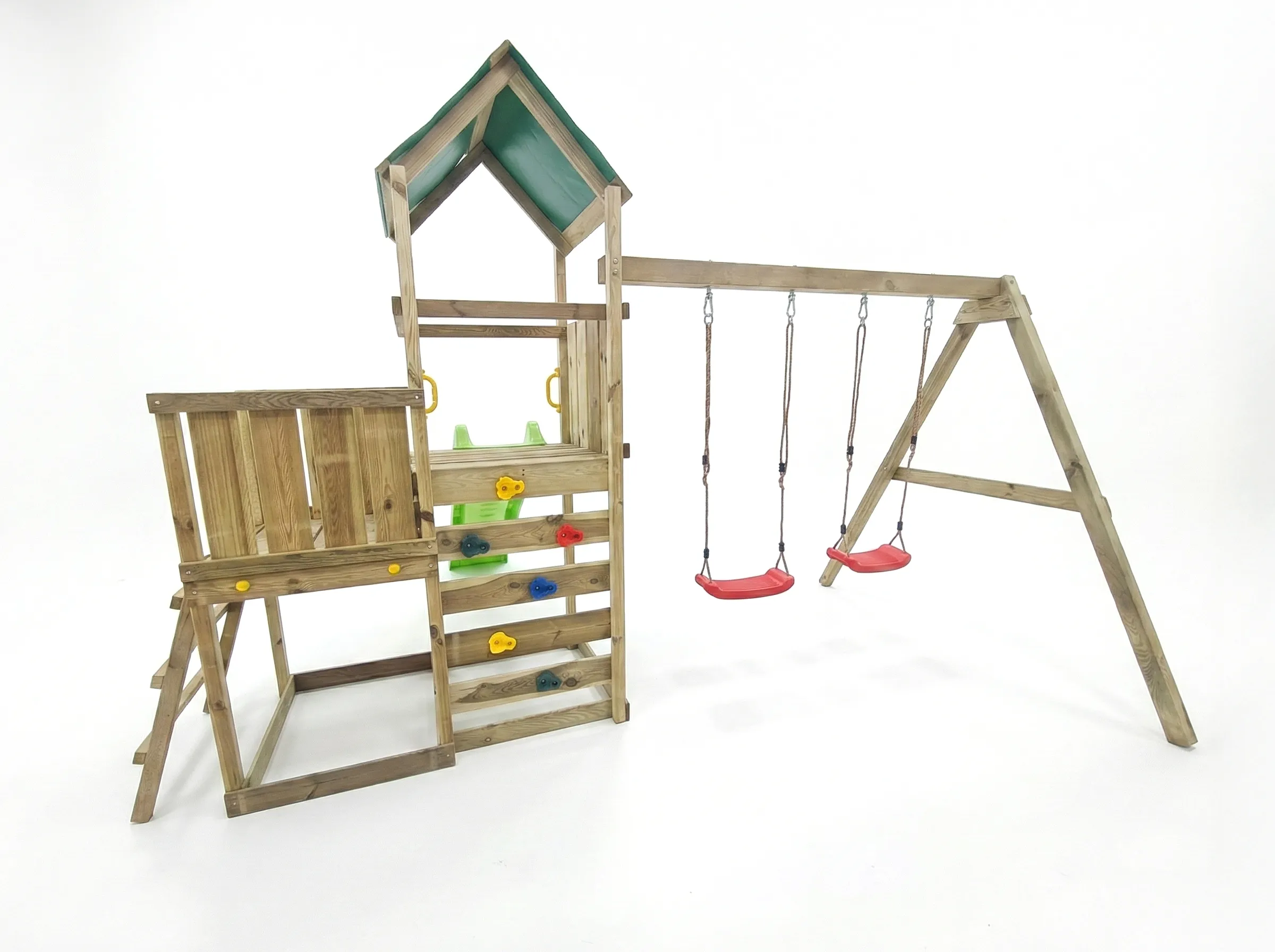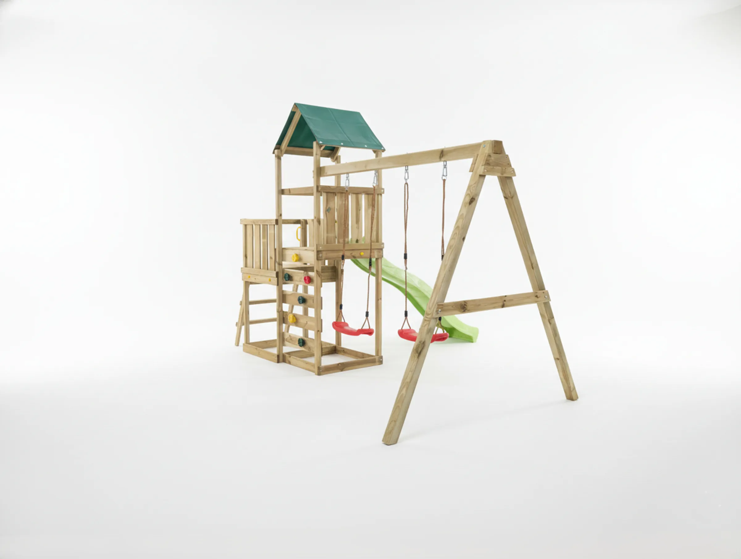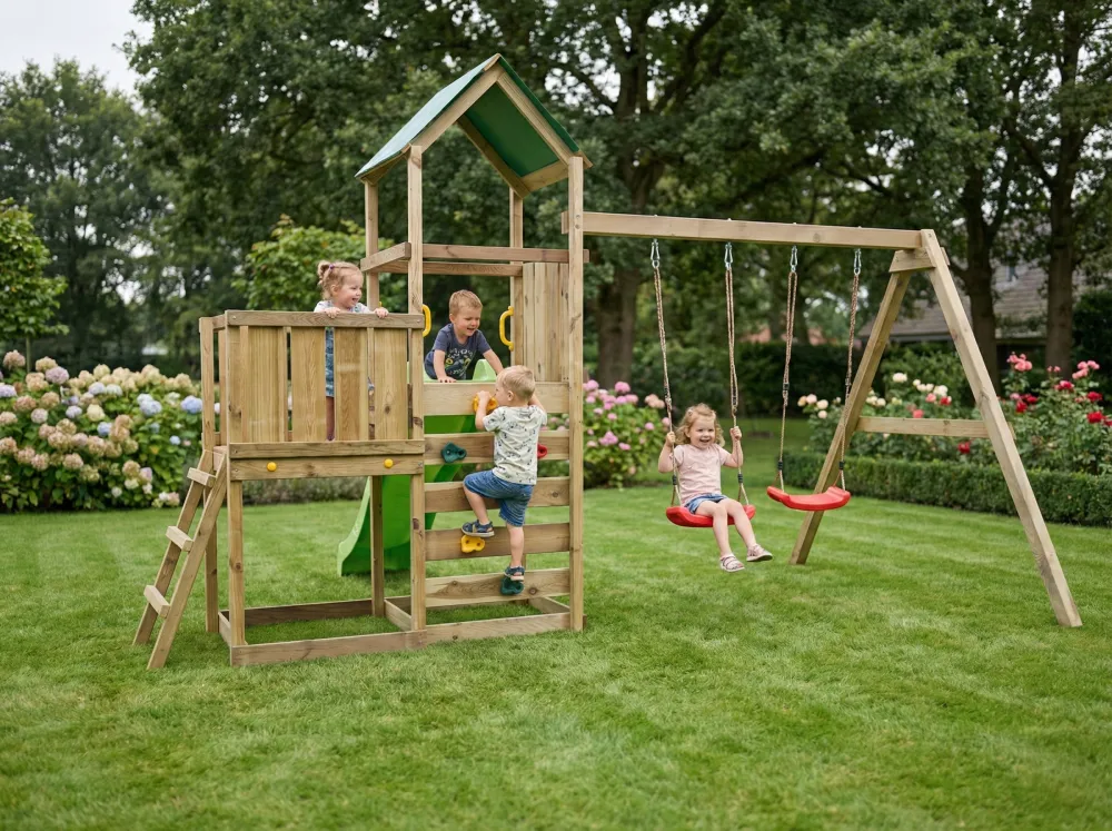 Legetårnet er udstyret med et grønt, vandafvisende stoftag, som beskytter mod sol og let regn, samt gule sikkerhedshåndtag, der giver ekstra tryghed ved adgang til platformene. Klatrevæggen med farverige klatresten styrker motorik og balance, mens de to røde gyngesæder med justerbare ophængsreb gør det nemt at tilpasse gyngerne til barnets højde.